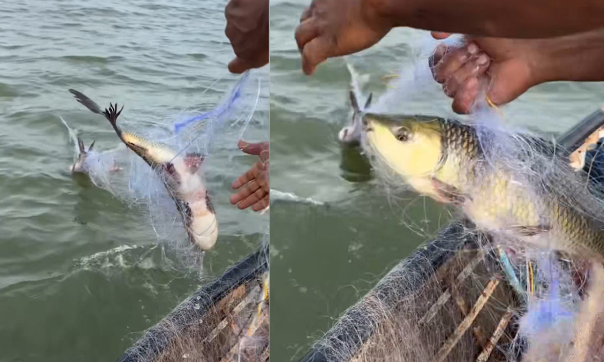 Đoạn video ghi lại cảnh tượng phấn khích khi một người đàn ông kéo lưới và bất ngờ thu về một mẻ cá lớn. Khi chiếc lưới dần được kéo lên khỏi mặt nước, hàng chục con cá lớn đang vùng vẫy tạo nên cảnh tượng vô cùng sôi động. Những con cá to lớn, mập mạp bám chặt vào lưới, khiến người xem không khỏi trầm trồ.